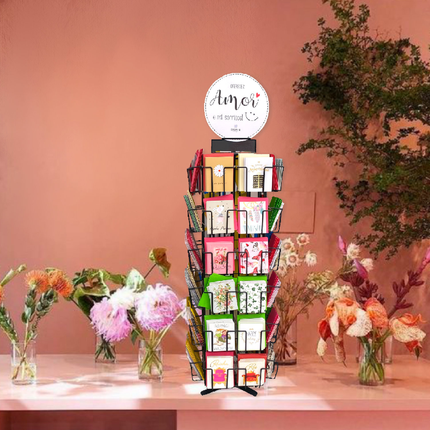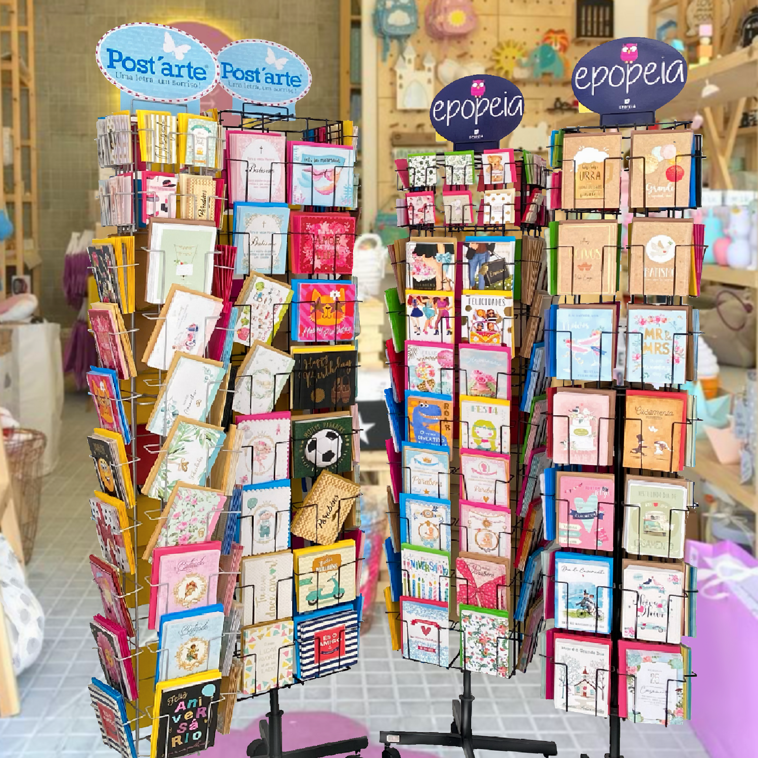 Formato minimalista quadrado com 48 slots para minicards, perfeito para vendas de balcão